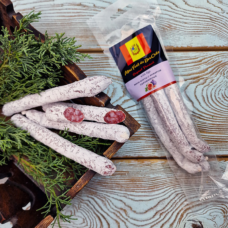 Колбаски «Mini Fuet» с инжиром (80 г) — это сыровяленая колбаса из натурального сырья и специй. Для улучшения вкуса и большей сочности в состав добавлены шпик и специи.